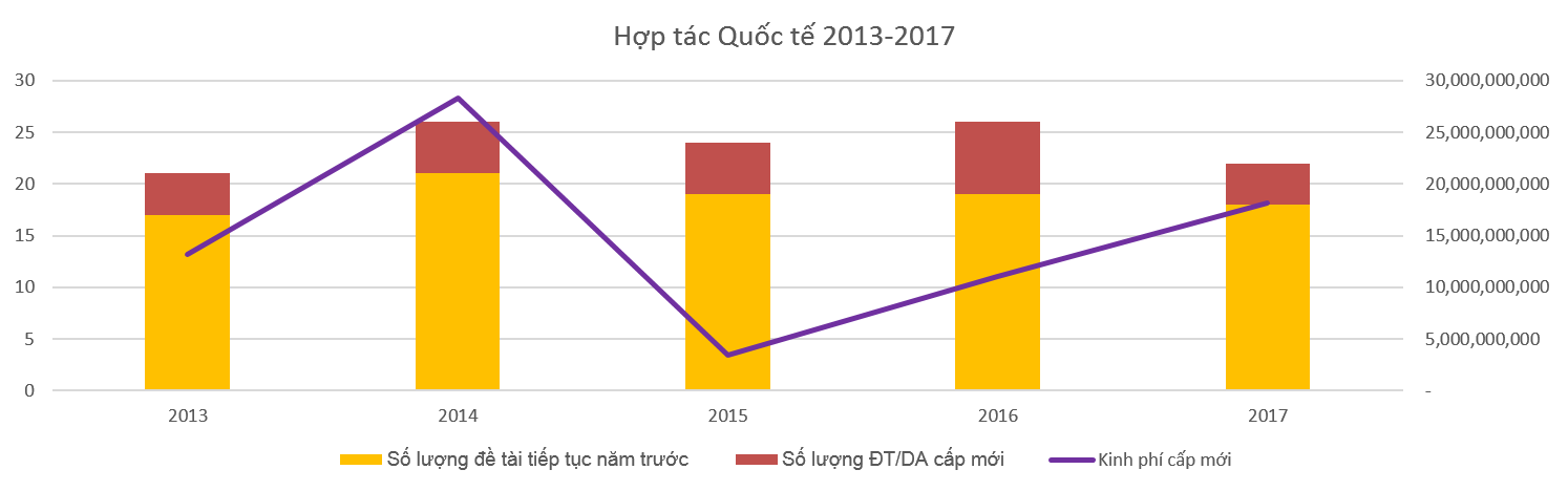 - Hàng năm triển khai trung bình khoảng trên 20 đề tài/dự án hợp tác quốc tế với tổng kinh phí trung bình hàng năm là 80 tỷ đồng.