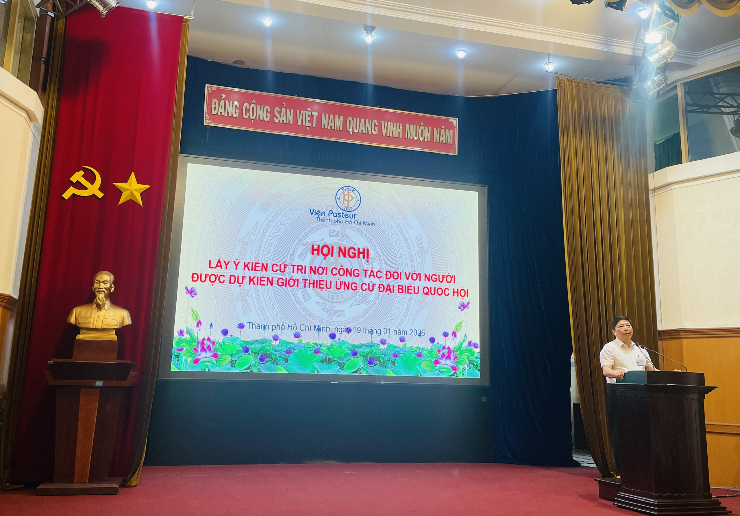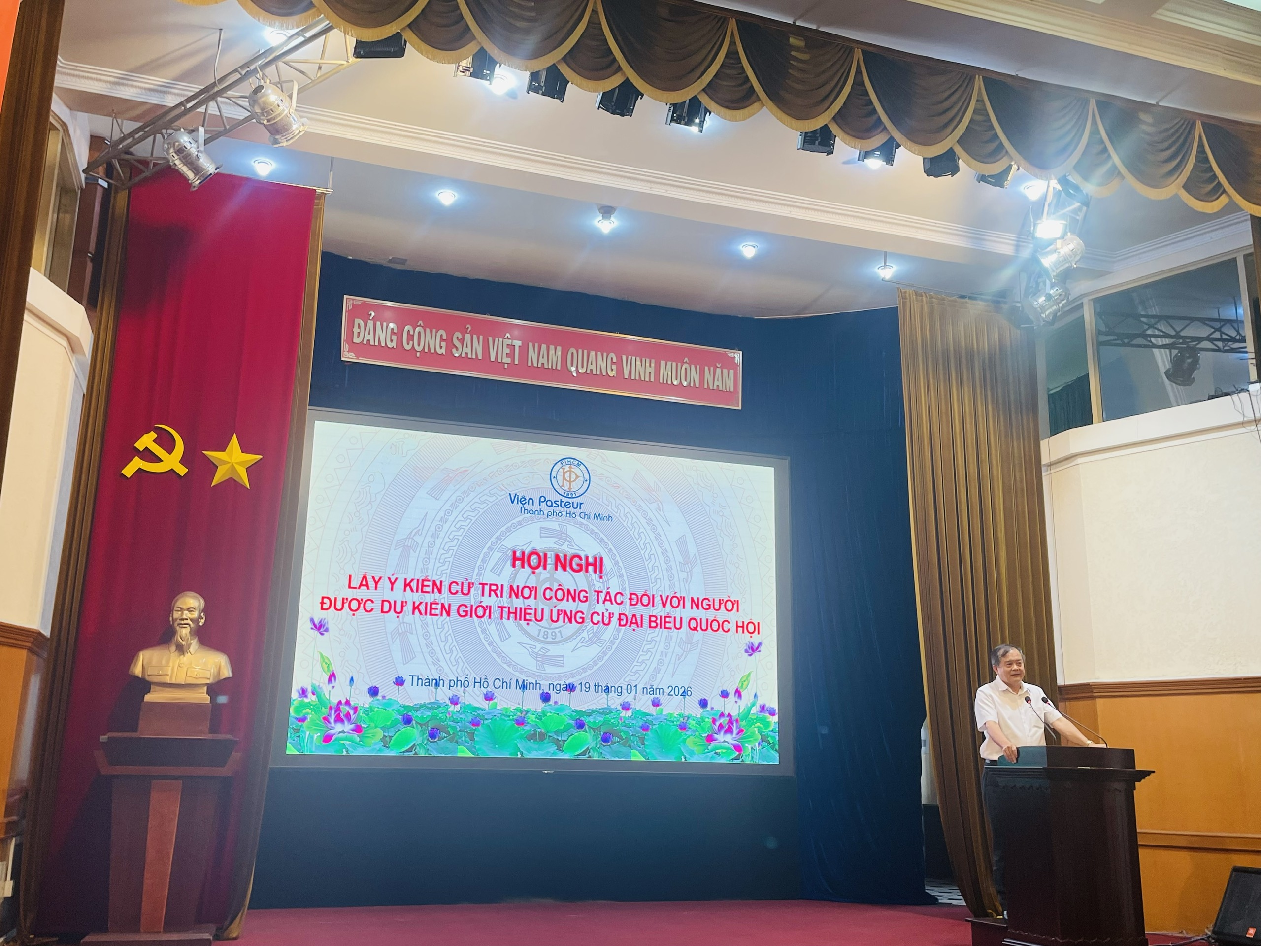Thực hiện quy trình giới thiệu người ứng cử đại biểu Quốc hội khóa XVI, nhiệm kỳ 2026 – 2031, chiều ngày 19/01/2026 và sáng ngày 20/01/2026 Viện Pasteur Thành phố Hồ Chí Minh (TP.HCM) đã tổ chức Hội nghị cử tri nơi công tác và Hội nghị ban lãnh đạo cơ quan (mở rộng) nhằm tiến hành lấy ý kiến cư tri nơi công tác đối với việc giới thiệu danh sách người ứng cử đại biểu Quốc hội, nhiệm kỳ 2026 – 2031. TS. BS. Đinh Xuân Thành, Phó Viện trưởng Viện Pasteur TP.HCM chủ trì và chỉ đạo Hội nghị.