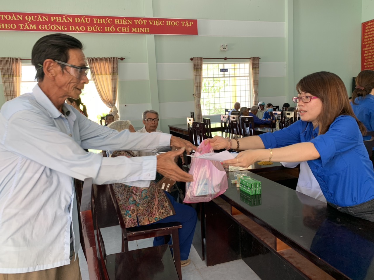 Đúng 8h30 sáng, xe đã tới ngay cổng nhà văn hóa - UBND xã Tân Tiến, rất nhiều bà con đang đợi. xe đến hơi trễ, xong không phụ lòng bà con chờ đợi, đội ngũ Y Bác sĩ, cùng với các bạn tình nguyện viên đã nhanh chóng vào vị trí, sắp xếp lại bàn ghế, chuyển thuốc và dụng cụ vào đúng vị trí của nó và triển khai khám bệnh ngay sau đó. Đến lúc này chẳng cần ai phải nói gì, mỗi người một việc vèo một lúc cũng đã khám và phát thuốc hơn 150 người.