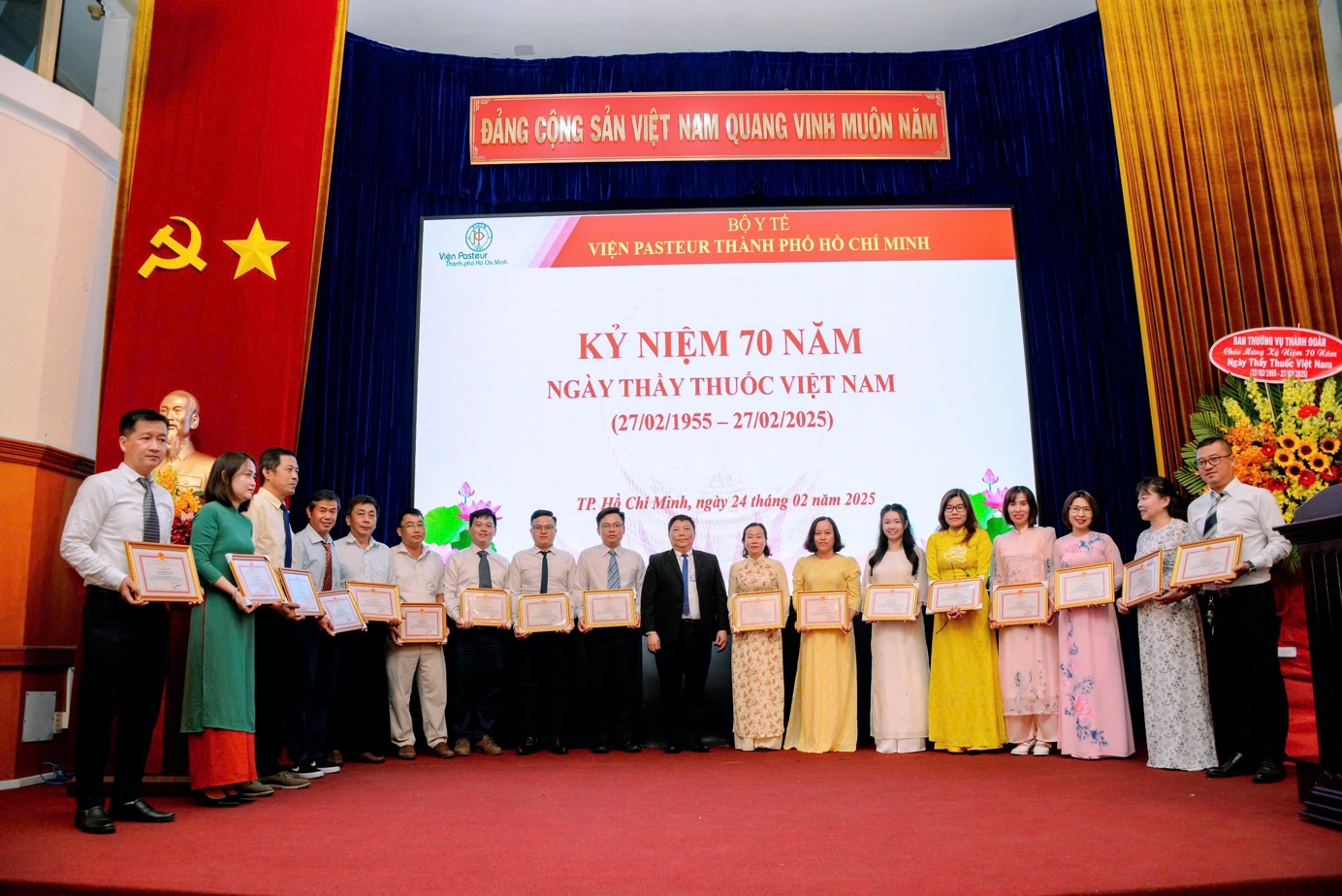 Chiều ngày 24/02/2025, Viện Pasteur Thành phố Hồ Chí Minh long trọng tổ chức Lễ kỷ niệm 70 năm Ngày Thầy thuốc Việt Nam (27/2/1955 - 27/2/2025). Buổi lễ có sự tham dự của đồng chí Lê Lan Hương, Phó Vụ trưởng Vụ Tổ chức Cán bộ, Bộ Y tế và đồng chí Nguyễn Hoàng Lên, Phó Bí thư Thường trực Đảng ủy Khối cơ sở Bộ Y tế, cùng tập thể Lãnh đạo, cán bộ, viên chức và người lao động của Viện.